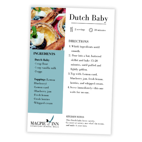 We’ve been gathering these kinds of kitchen favorites—the ones that show up again and again, usually scribbled in margins or passed along without much ceremony. We’d love to hear your favorite Magpie Inn breakfasts.